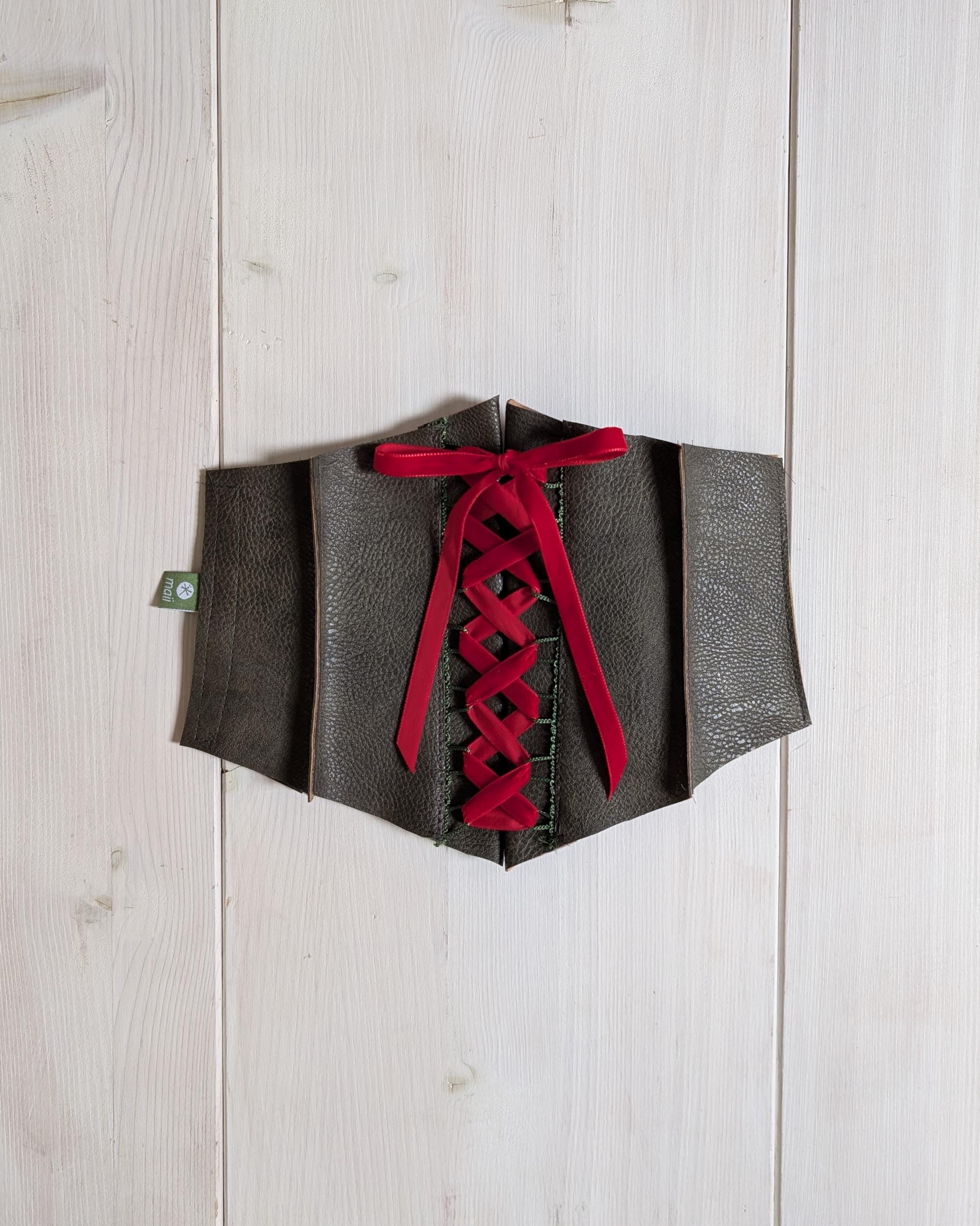 the gray felt hat with dangerously twining snake, the red fur collar, lined with taffeta and taffeta bow, so that it can be worn turned black, an olive green corsage made of solid leather, which can be adjusted to the width with black satin ribbon at the front and then comfortable Velcro on the side, cuffs in trumpet form of black taffeta, which can be easily pulled over the upper arm thanks to stretchable jersey cuffs, and a black taffeta skirt, nicely crisp with a petticoat of flaming red tulle, which makes him wonderful and buzzing the front gathering looks great.