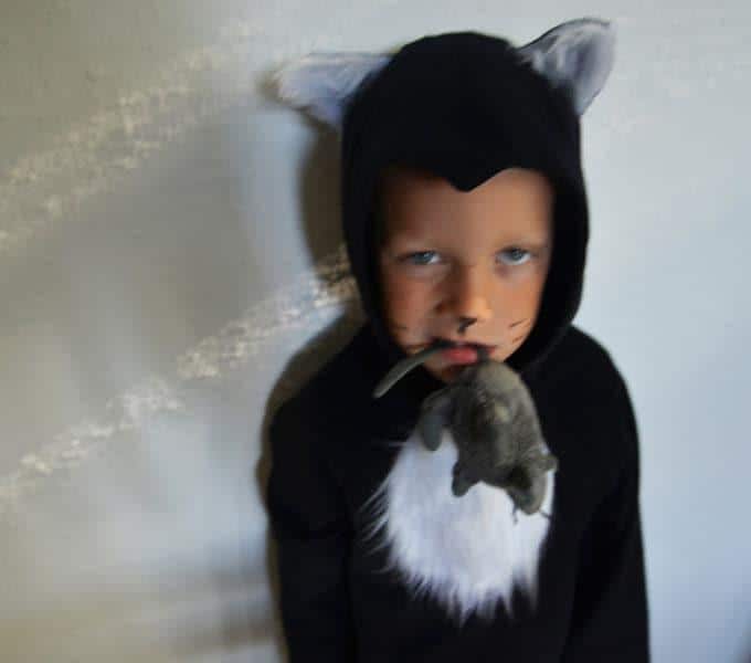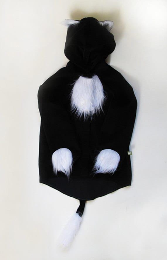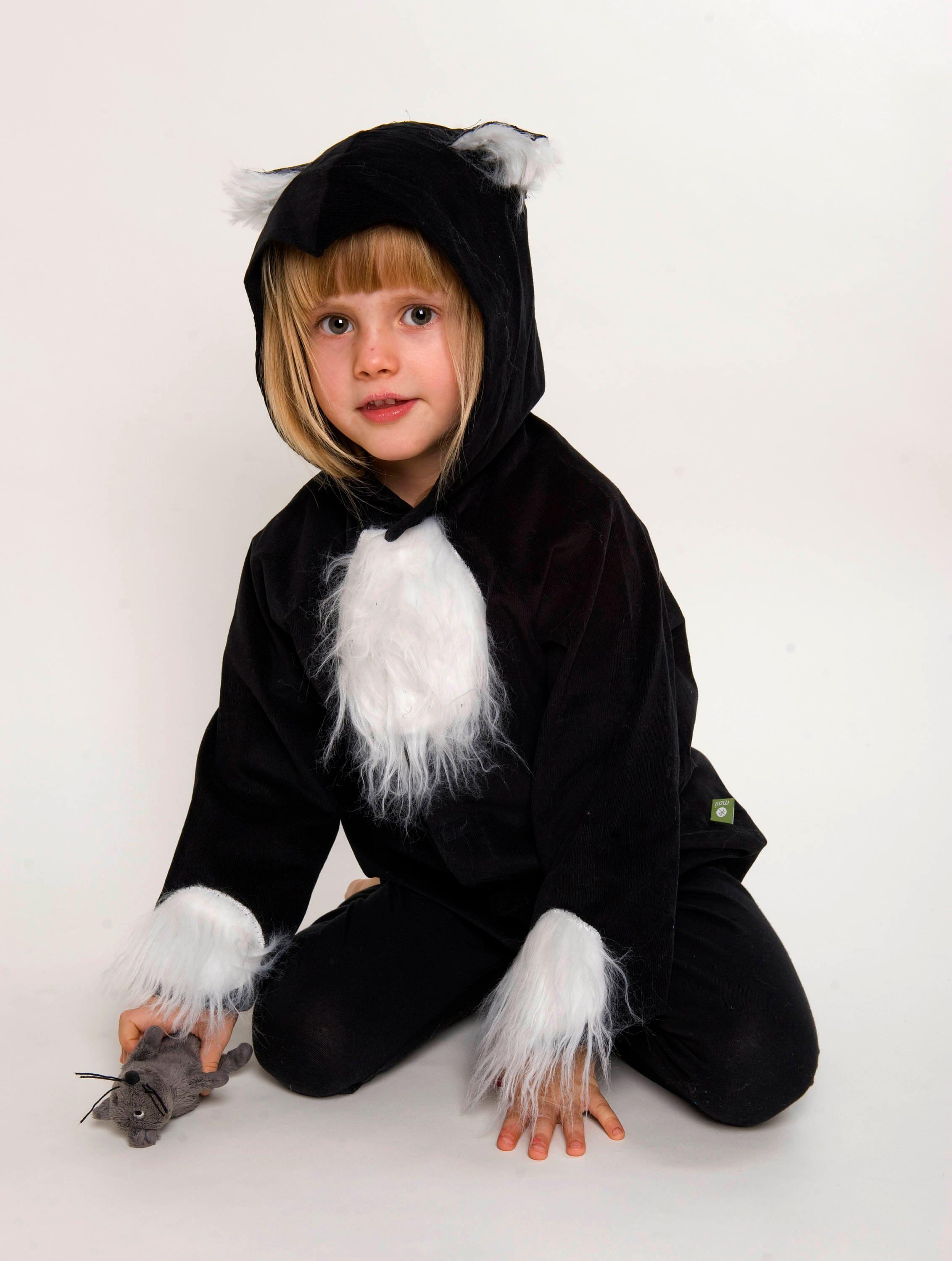 Finally a cotton costume to fondle! Our kitten is made of black corduroy, has a white bib, white paws and a white tail tip of cuddly longhair fur.