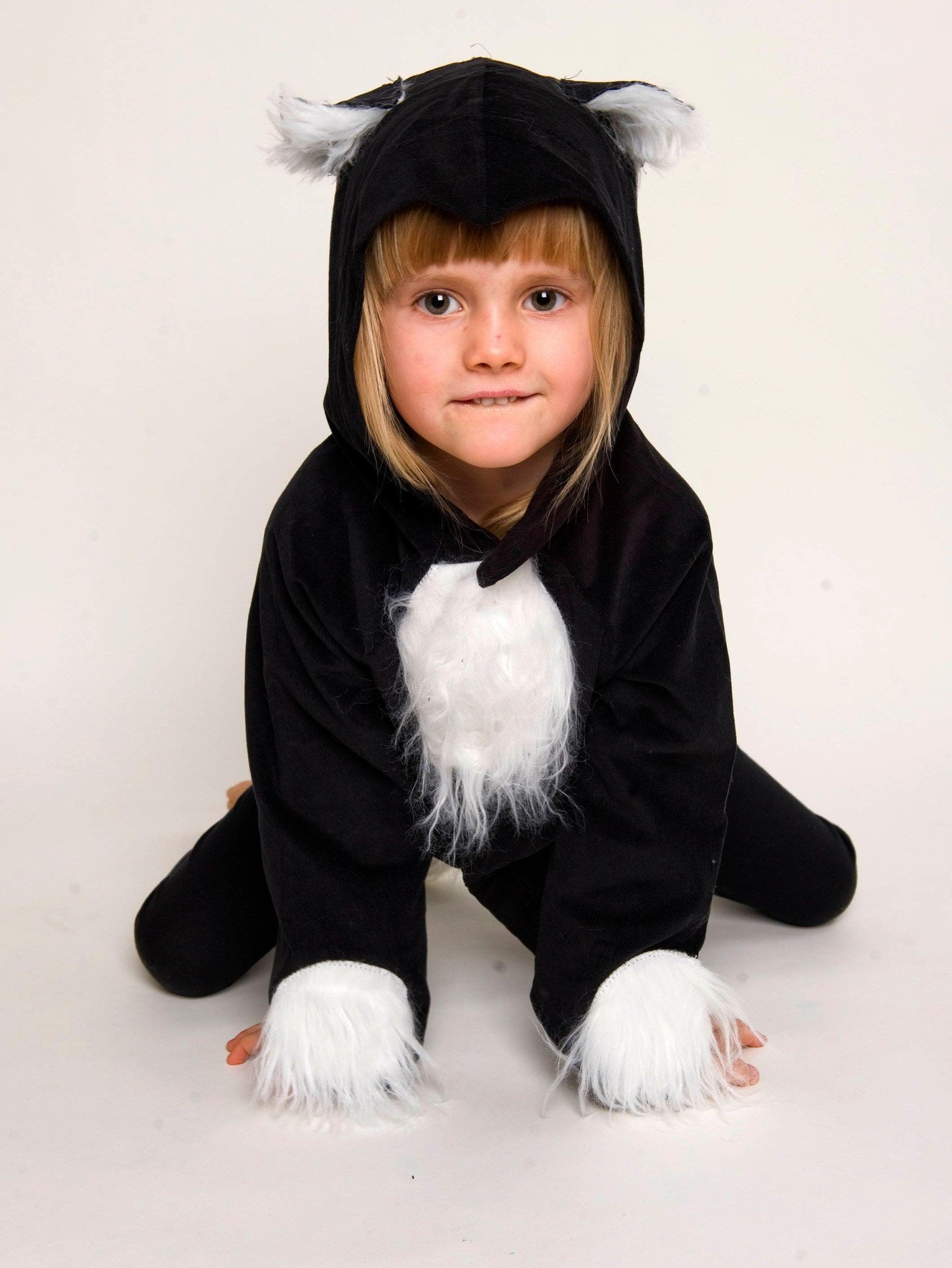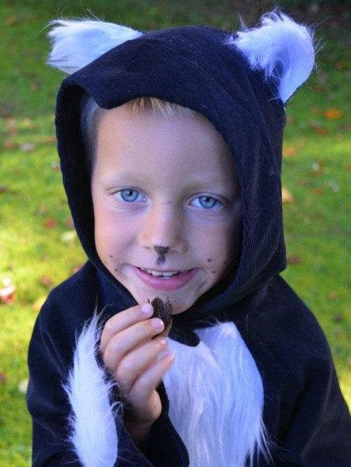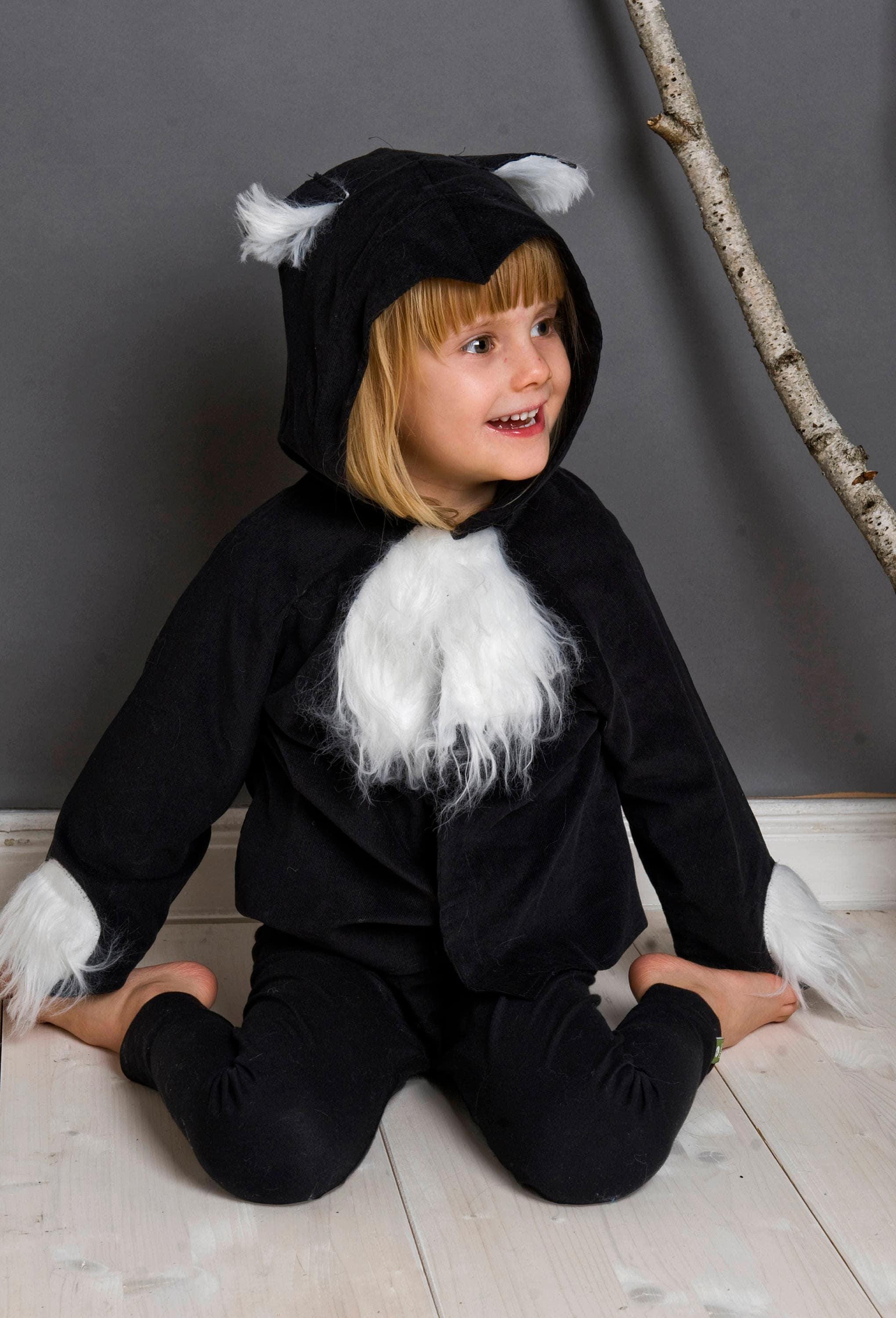 The costume can be worn both as a dressing up and, if the children do not want to undress, even as a everyday jacket. It can be easily closed by children's hands with Velcro and is made of 100% cotton cord, the white fur insert on the chest, sleeves and tail is made of 100% PES.