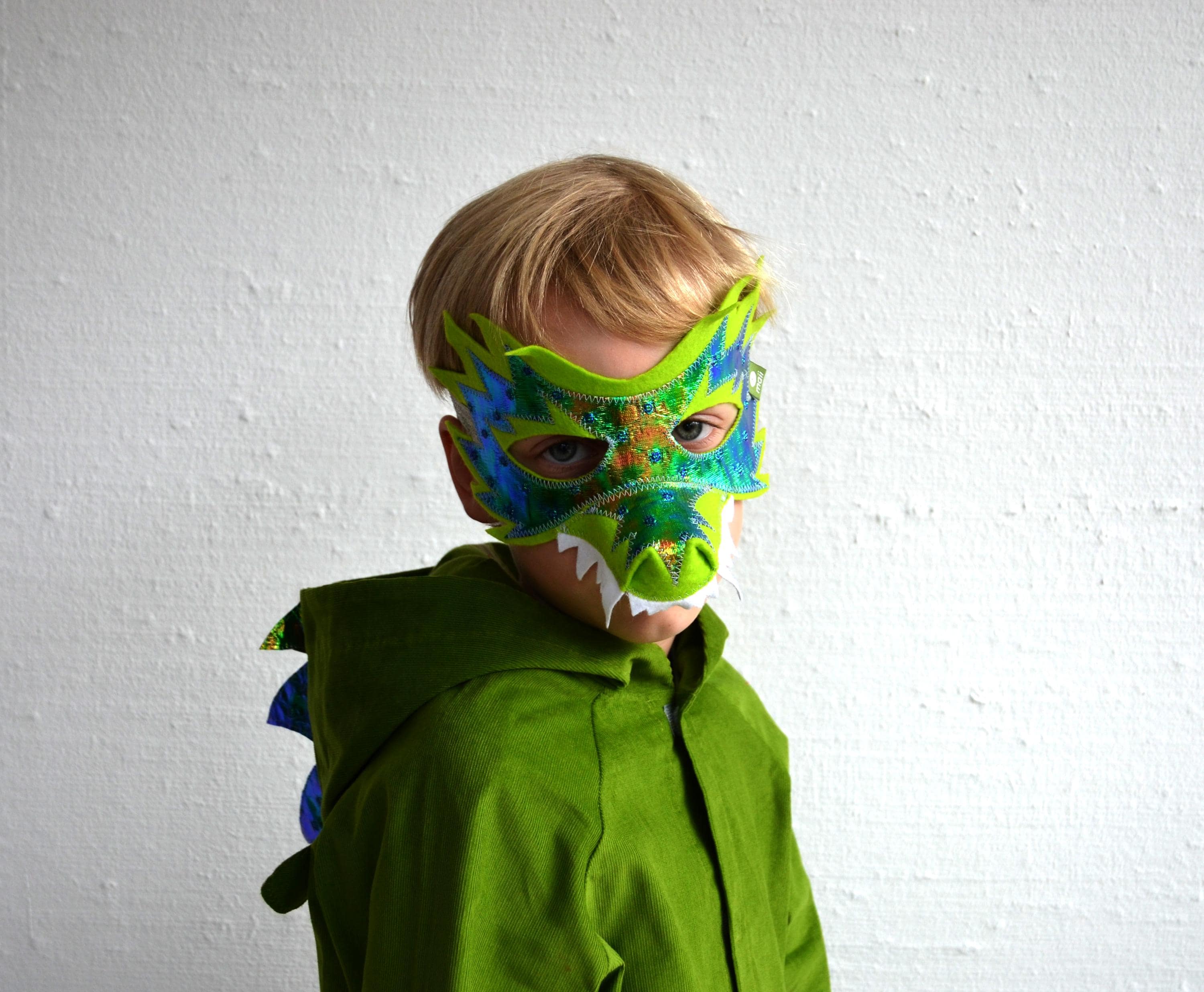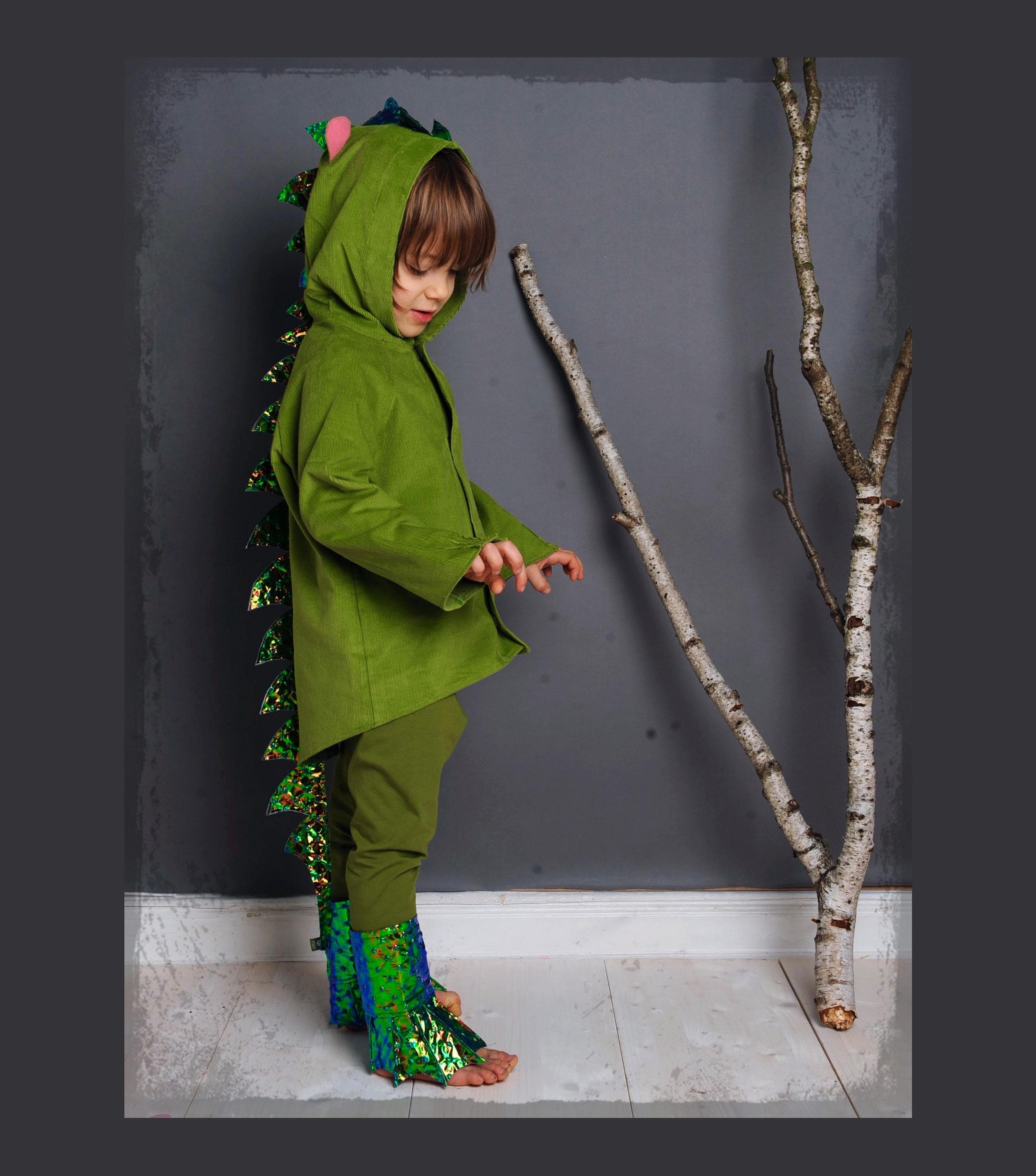 The costume can be worn both as a dressing up and, if the children do not want to undress, even as a everyday jacket. It can be easily closed by children's hands with Velcro and is made of 100% cotton cord, only the effects of the costume, the dragon's spikes, consists of 100% PES.